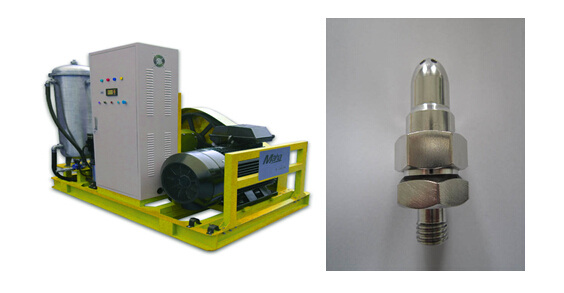高壓射流清洗:是使用高壓泵打出高壓水,并經(jīng)過一定管路到達噴嘴,再把高壓力低流速的水轉(zhuǎn)換為高壓力高流速的射流,然后射流以其很高的沖擊動能,連續(xù)不斷地作用在被清洗表面,從而使垢物脫落,最終實現(xiàn)清洗目的。